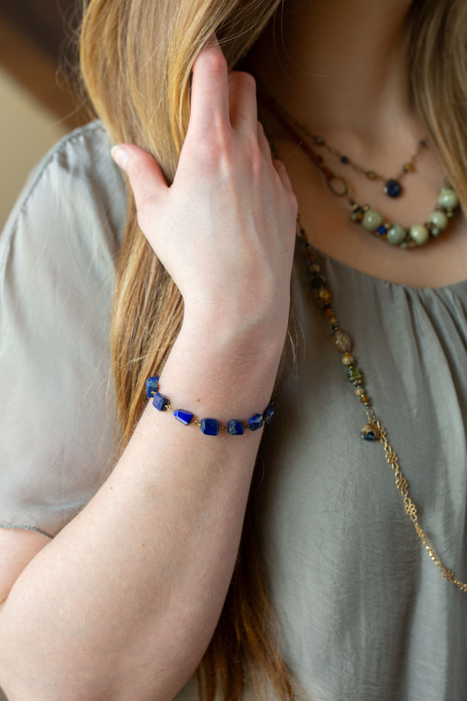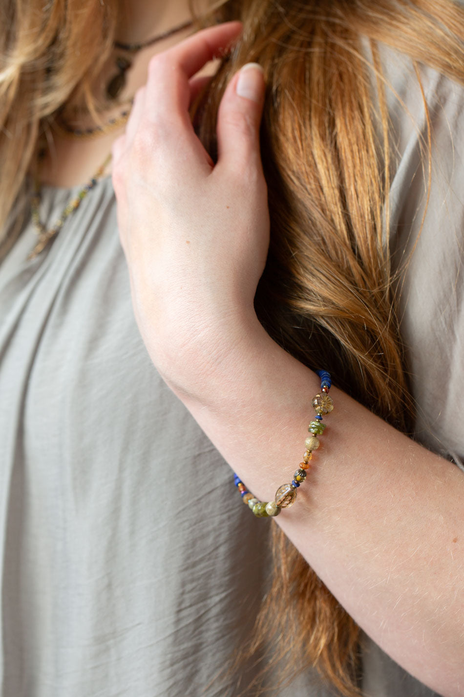 Sacred Heart 7.5-8.5" Lapis, Czech Glass, Hessonite Garnet Multistrand Bracelet