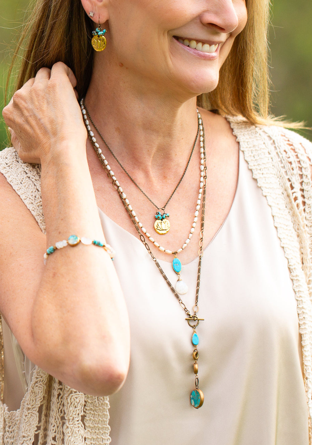 Rustic Creek 20.5-22.5" Freshwater Pearl With Czech Glass, Turquoise Dangles, Antique Brass Leaves Cluster Necklace
