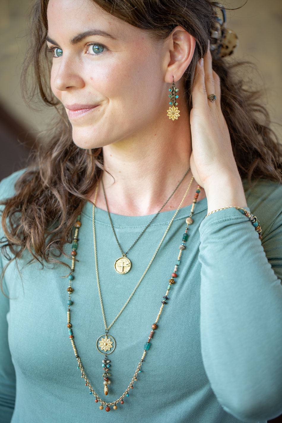 Wisdom Within 18-20" Shell, Crystal With Tibetan Turquoise Cluster Necklace