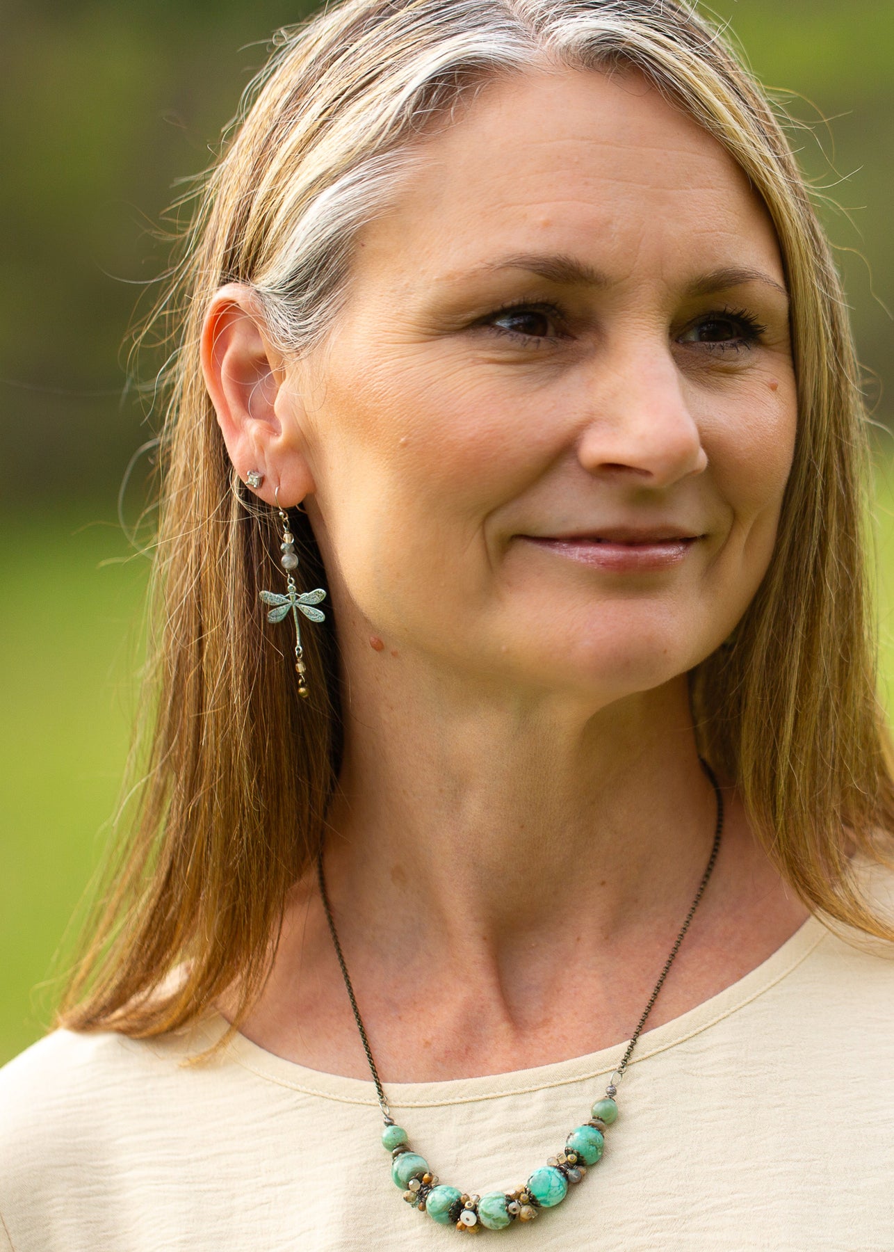 Wisdom Within Kyanite, Czech Glass With Patina Antique Silver Dragonfly Cluster Earrings